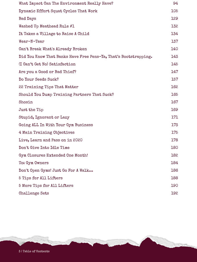 Since 1998, I’ve been posting my thoughts, ideas, and rants on my blog, the elitefts Q&A, and social media platforms. There have been some posts that have stuck in readers’ mind for whatever reason. I’ve received feedback on these posts, and countless questions as well. They have become classics, writings that I and the readers of EliteFTS go back to time and time again. Some have been deleted from the site, others lost in archives, and there are others that were turned into articles. For that reason, over the years I gathered them in the Gym Talk Series and even added a few others that have never been posted on the site. Although I and many others get our fair share of laughs from these posts, the lessons found in these posts are that you should never take yourself too seriously and have fun with your training. Look around and you will see that much of what we do can either be or is already very funny. A very special thank you goes to all those who have been associated with elitefts ranging from customers, vendors, consultants, to contractors and staff. And, of course, thanks to all of our readers for ...taking the time to read these posts.