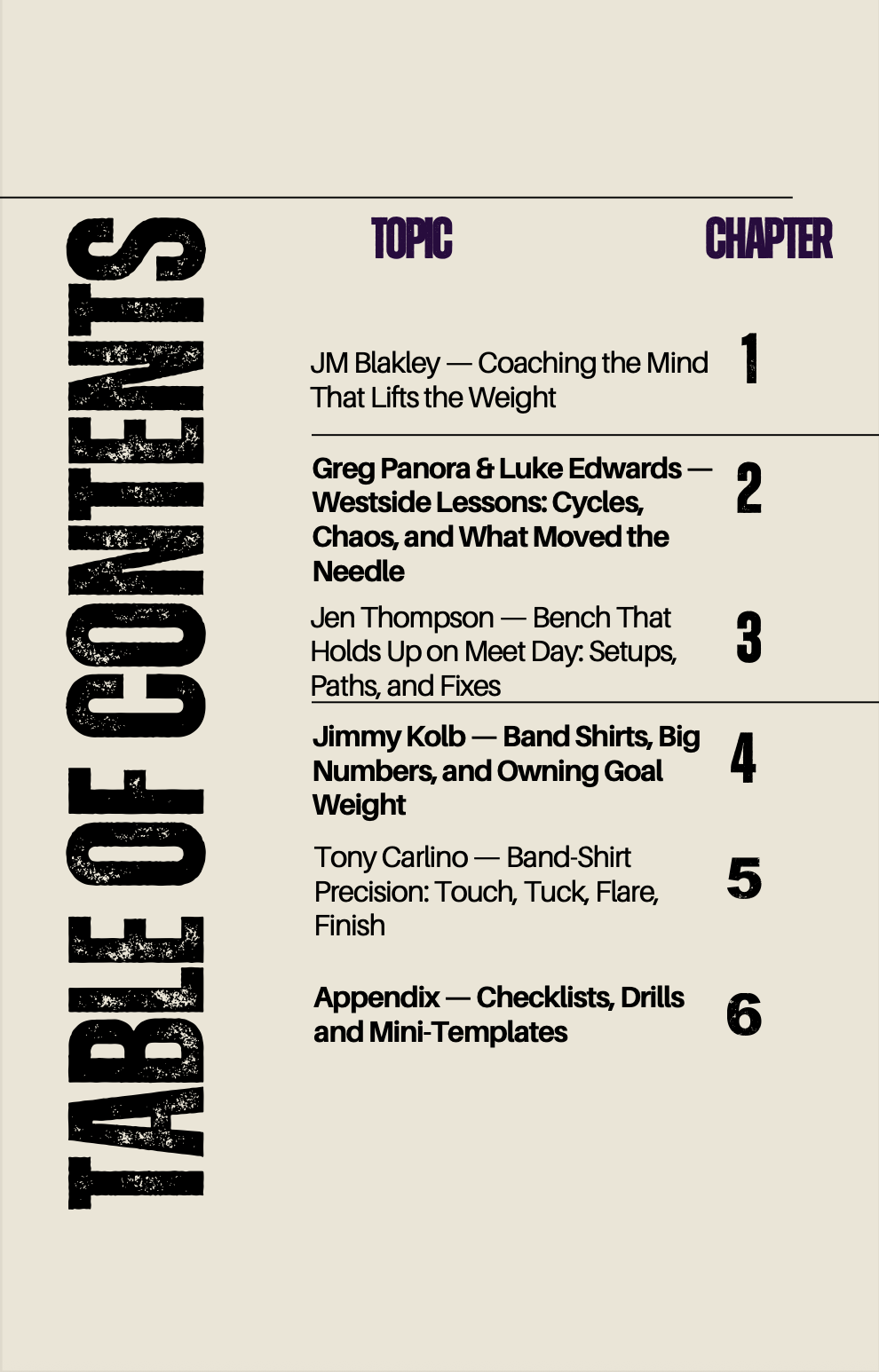 Make every rep count. The Bench Code brings together proven methods from JM Blakley, Greg Panora, Luke Edwards, Jen Thompson, Jimmy Kolb, and Tony Carlino to help you bench more—raw or equipped—without fluff. It’s clear, practical, and built for lifters and coaches who value Focus, Trust, and Strength. Live, Learn, Pass On.