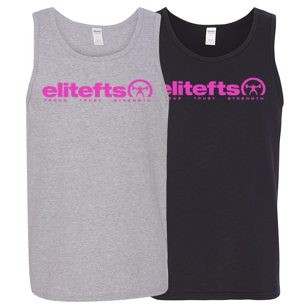 two tank tops, one black and one gray, with a blue EliteFTS logo in royal blue letters